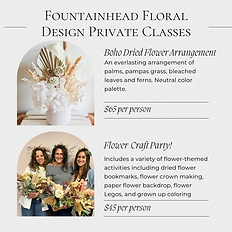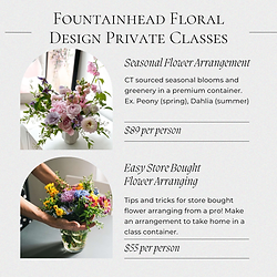 Book a private class for up to 15 guests at our Milford, CT studio! We'll provide all the supplies and materials to create a variety of items that suit all levels Choose from 1) Seasonal Flower Arrangement - $89/pp 2) Holiday Flower Arrangement $79 per person 3) Easy Store Bought Flower Arranging $55 per person 3) Boho Dried Flower Arrangement or Wreath $69/pp 4) Flower Craft Party $45/pp In order to reserve your class, please email Kate at kate@fountainheadfloraldesign.com for availability. We will be able to post your private class link to our website for participants to book their tickets.